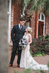 Located in the heart of downtown Columbia, the carefully-restored building originally built in 1903 encompasses old industrial charm in its grandeur. Kayden and Alan's ceremony took place in the exquisite Granby Room, which boasts intricate glass windows, rich exposed columns, and gorgeous historic charm. While there’s no doubt about the beauty of historic venue, all eyes were on Kayden as she floated down the aisle in her ethereal gown, complete with cascading lace detail. She carried an arrangement of soft lavender and white blooms interspersed with fresh greenery. Her bridesmaids complemented her perfectly in purple gowns. Alan and his groomsmen looked handsome in classic charcoal suits with plum colored ties. All eyes were on the soon-to-be Browders as they recited their vows to one another in front of a minimalistic altar with an abundant floral arrangement reminiscent of Kayden’s beautiful bouquet.